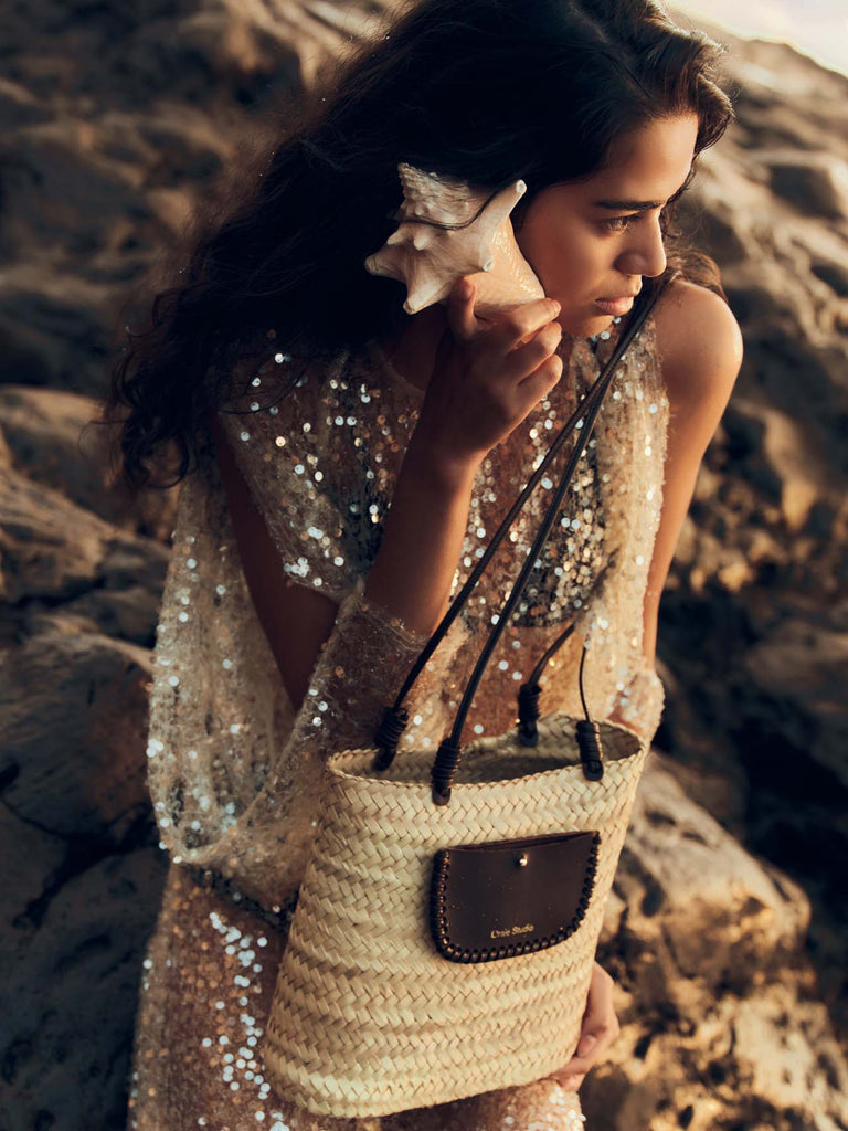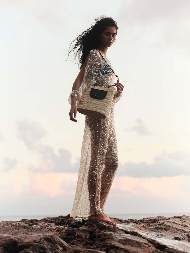 Designed to combine style and practicality, it features long , slender, and elegant leather handles , allowing it to be carried on the shoulder or by hand. Secured with a series of knots, they reinforce the handcrafted character of the bag. Its final touch lies in its front pocket, entirely hand-braided with leather thread , which reveals precise craftsmanship and adds texture and character to the silhouette.