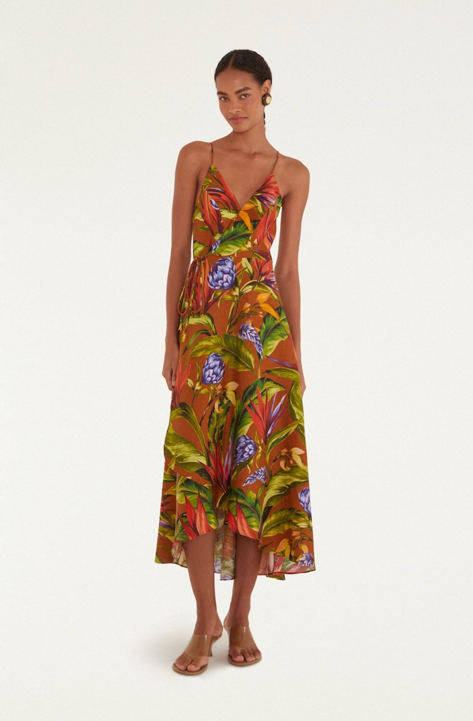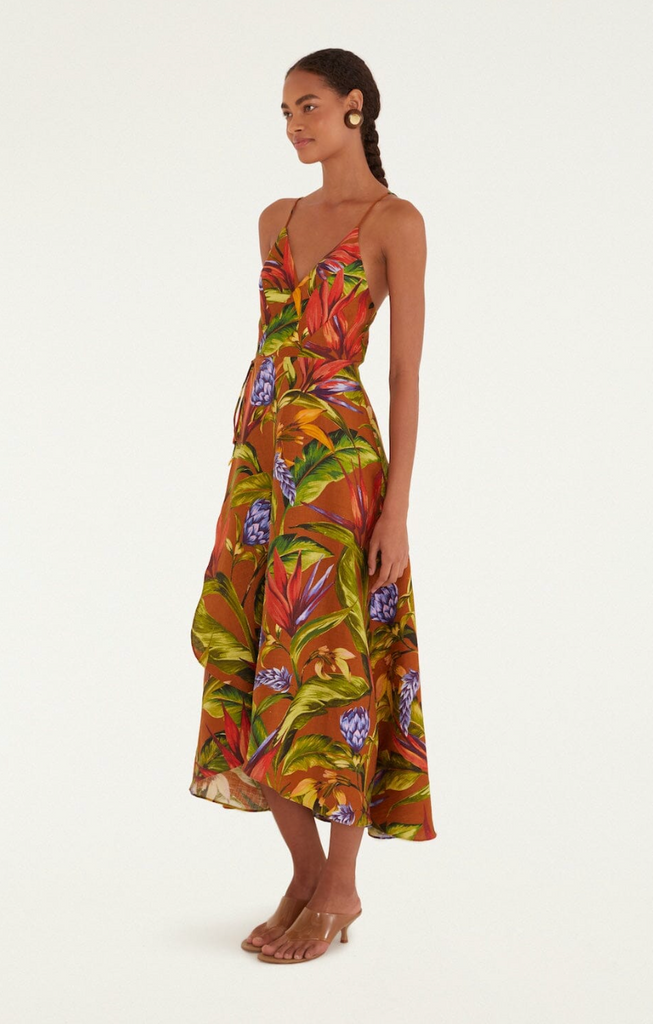 Effortless elegance for the modern traveler. This Brown Florart Euroflax™ Premium Linen Midi Wrap Dress from FARM Rio transitions seamlessly from your favorite summer lunch spot to your European getaway. The premium linen breathes beautifully in any climate, while the adjustable wrap silhouette flatters every frame—no tailoring needed. Rich earthy tones and vibrant florals photograph beautifully, and the tie closure packs wrinkle-free into any carry-on. A timeless investment piece that works as hard as you do, whether you're navigating the city or exploring the world. Tie side wrap closure, sleeveless.