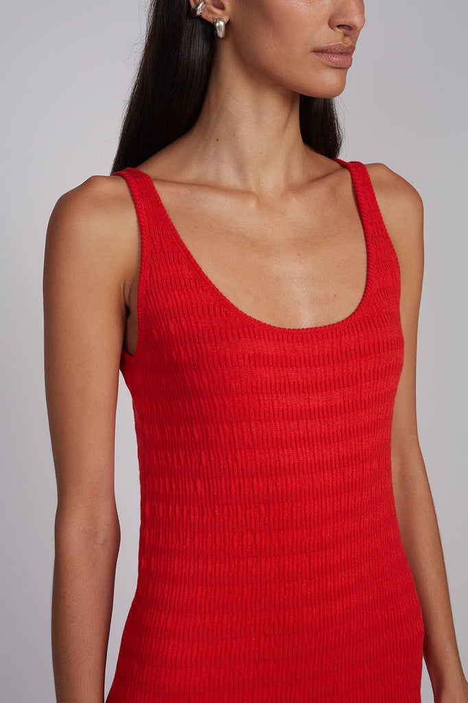 Freya is a slim seersucker-stitch tank dress that transitions into a dropped-waist fluted rib skirt, creating graceful movement and a beautifully balanced silhouette. Designed with flattering scoop necklines at the front and back, it makes a statement in chic, vibrant Rosso Red. Effortless from day to night, Freya rolls neatly into your vacation suitcase or slips on with ease for polished everyday wear.