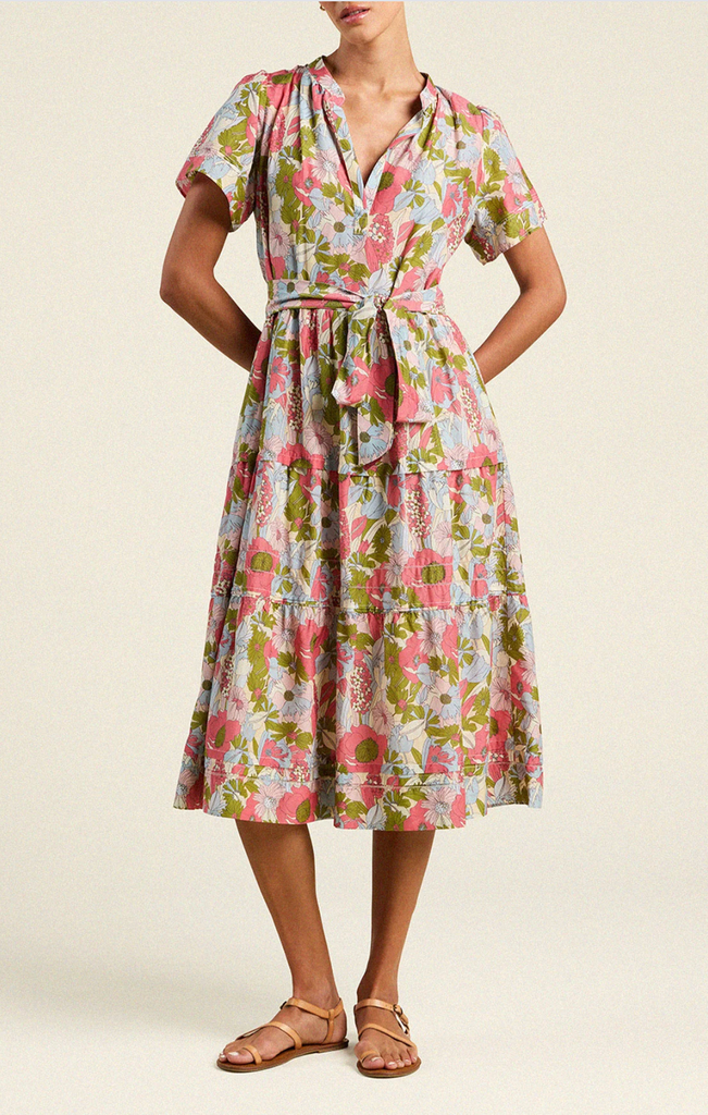 The Luana dress is an effortless pull-over style featuring a flattering v-neck front and short sleeves. A subtle drop waist with loose elastic seaming flows into a graceful, long skirt, it's perfect for weekend getaways and holiday gatherings. Crafted from soft cotton voile in the Tarsila Bloom floral print, this dress includes a self-fabric tie belt and practical side pockets for everyday ease. Size down if between sizes for a more tailored fit.