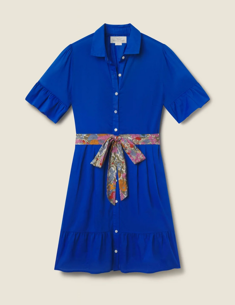 The Martinique mini dress brings effortless elegance with its flowing silhouette. Long pleats from the waist create graceful movement through the tiered skirt, while hidden side pockets add practical style. Crafted from soft 100% cotton voile, this dress features a matching self-fabric sash and complementary contrasting floral belt for versatile styling. The cobalt blue hue offers a fresh, summer aesthetic that transitions seamlessly from day to evening wear.