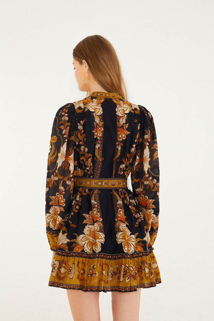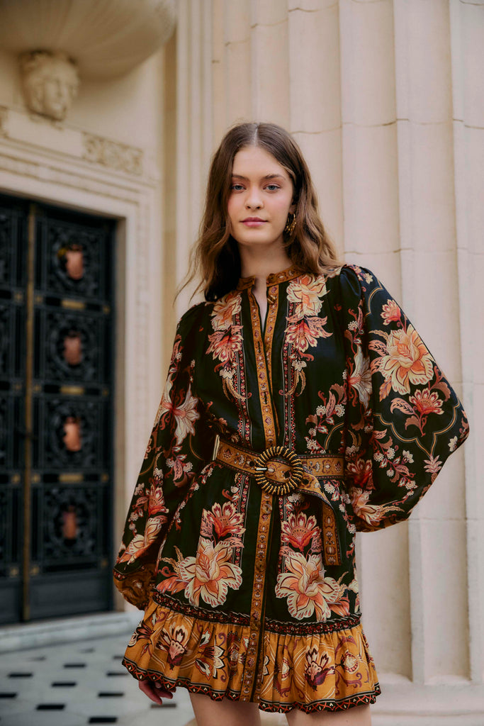 Step into a world of playful elegance with the Black Majestic Garden Beaded Buckle Long Sleeve Mini Dress by FARM Rio. This enchanting piece features a high neckline that frames the delicate beaded floral patterns cascading across rich black fabric. The long sleeves gently gather at the wrists, while the fitted silhouette flares slightly at the hem, creating a graceful movement. Accentuated by a statement beaded buckle, it’s a dress full of vibrant charm and soft sophistication.