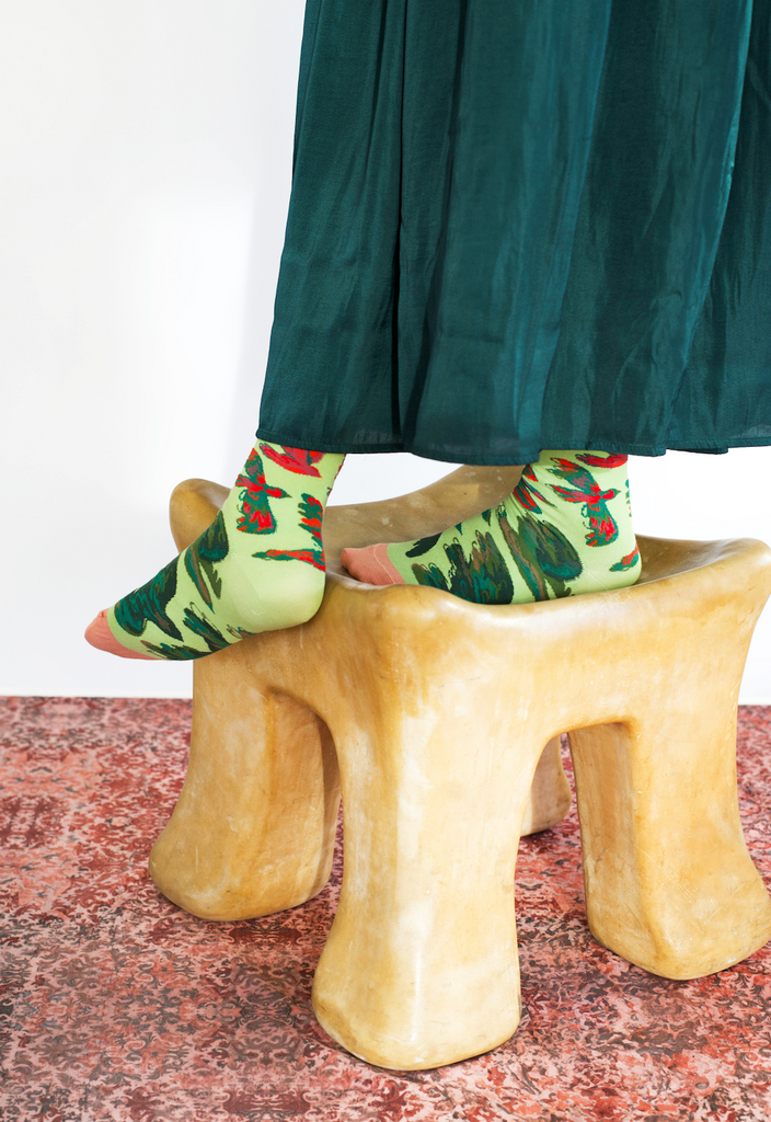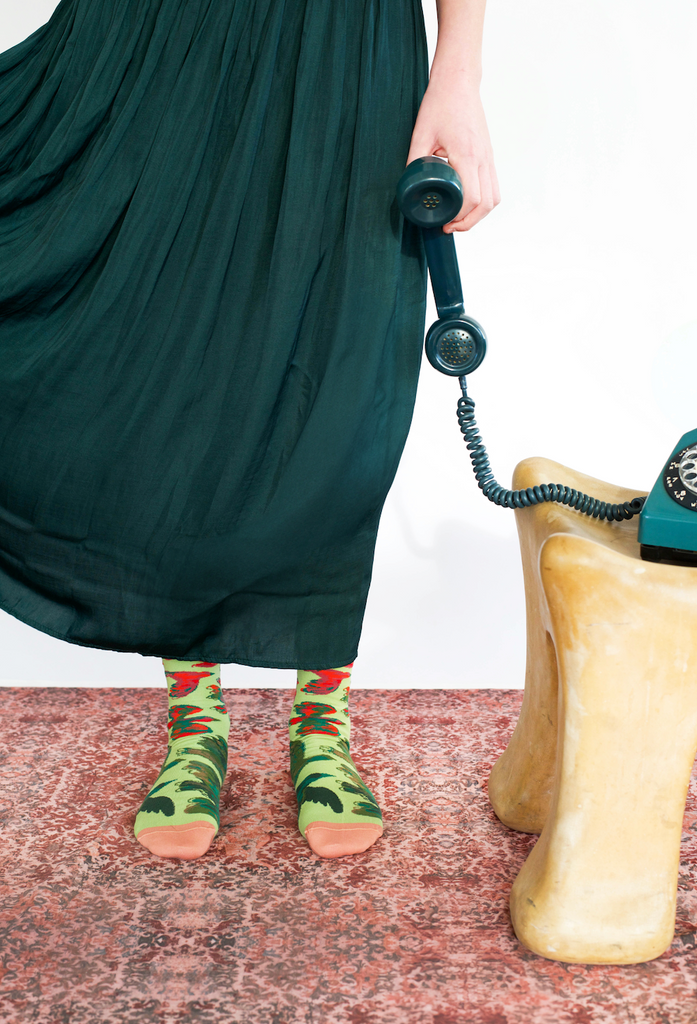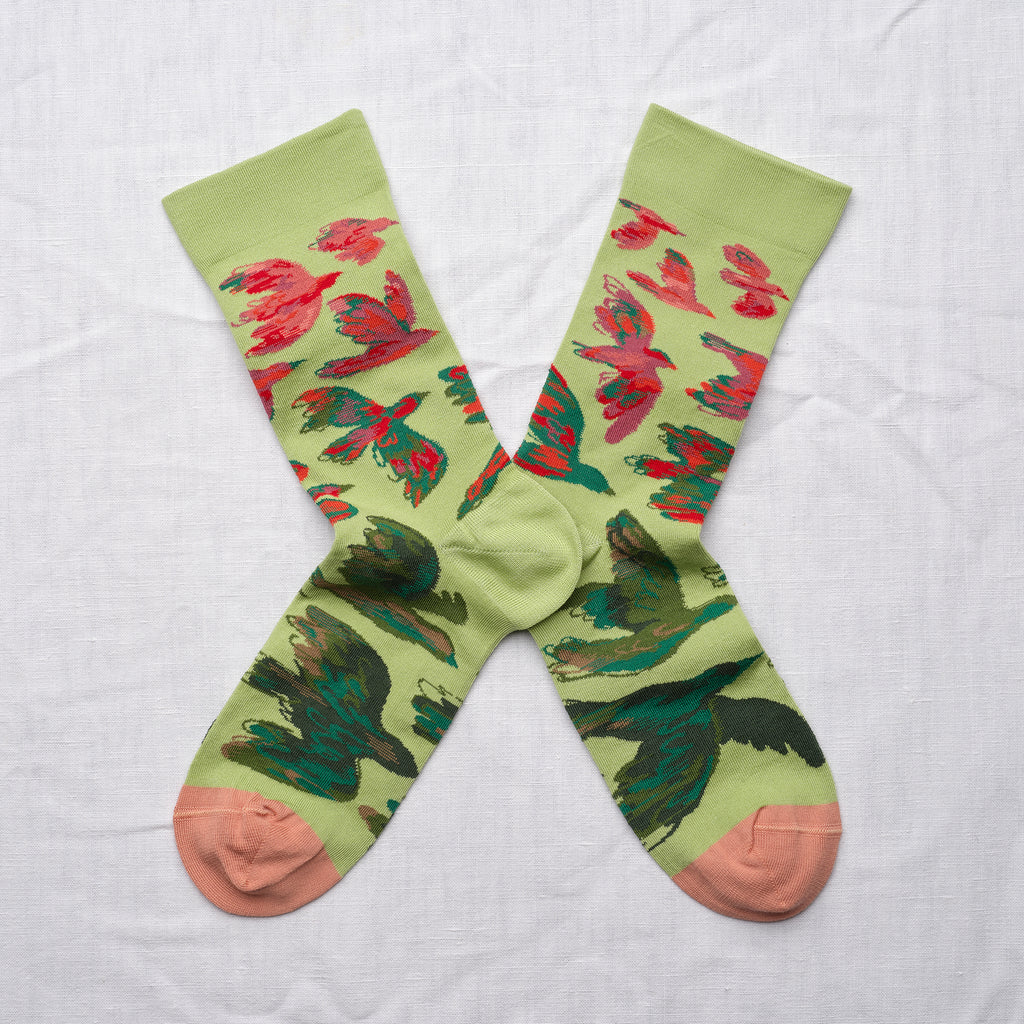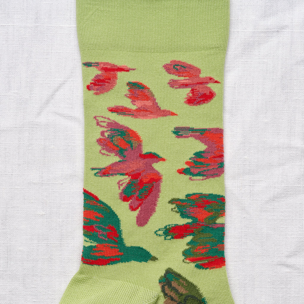 Crafted from premium Egyptian cotton, these mid-thigh socks showcase an elegant avian motif rendered in rich green and red hues against a vibrant lime backdrop. A delicate pale pink toe adds refined contrast to this French-made design, perfect for those who appreciate understated artistry in their everyday essentials.