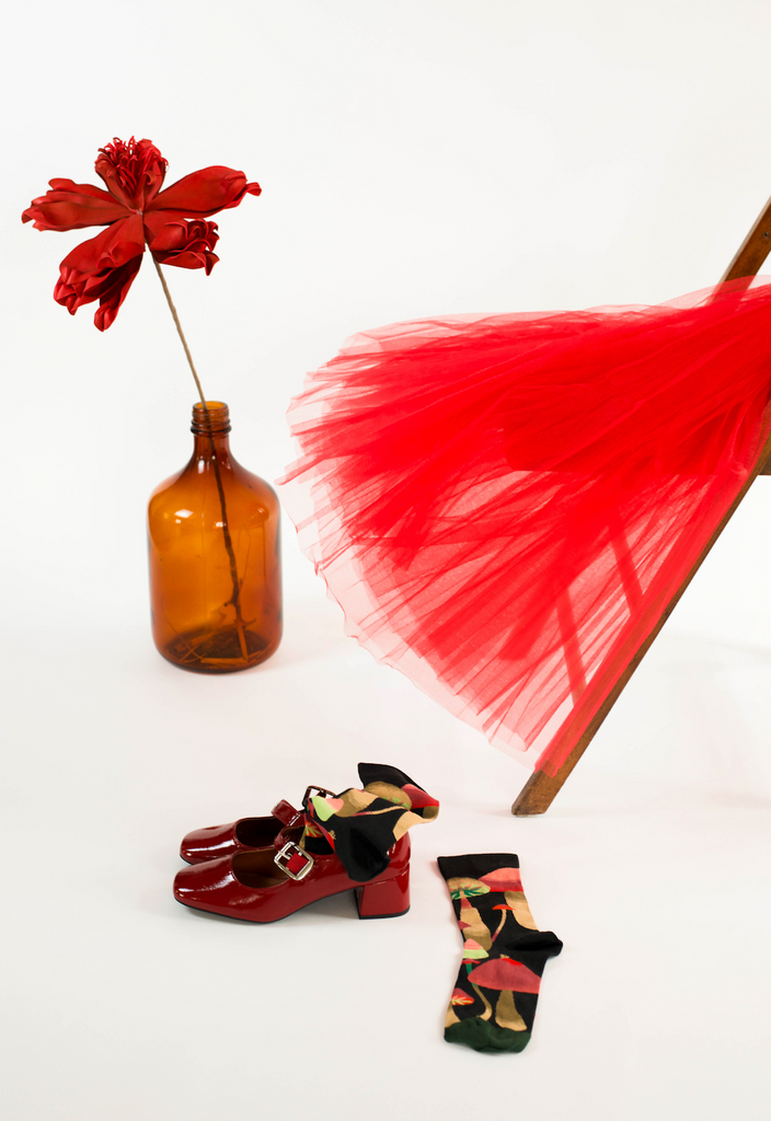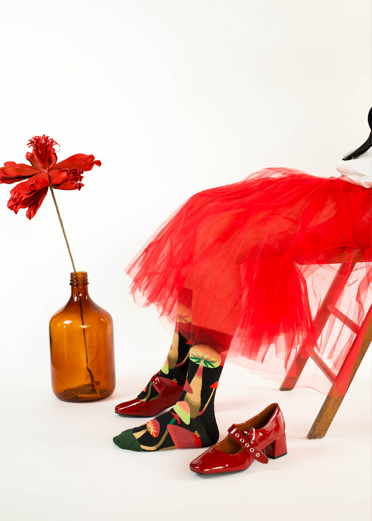 Crafted from premium Egyptian cotton, these French-made mid-thigh socks feature an enchanting mushroom motif rendered in soft pink, red, and beige tones against a sophisticated black base, complemented by deep green accents at the toe. A refined take on novelty hosiery that elevates everyday style with understated whimsy.