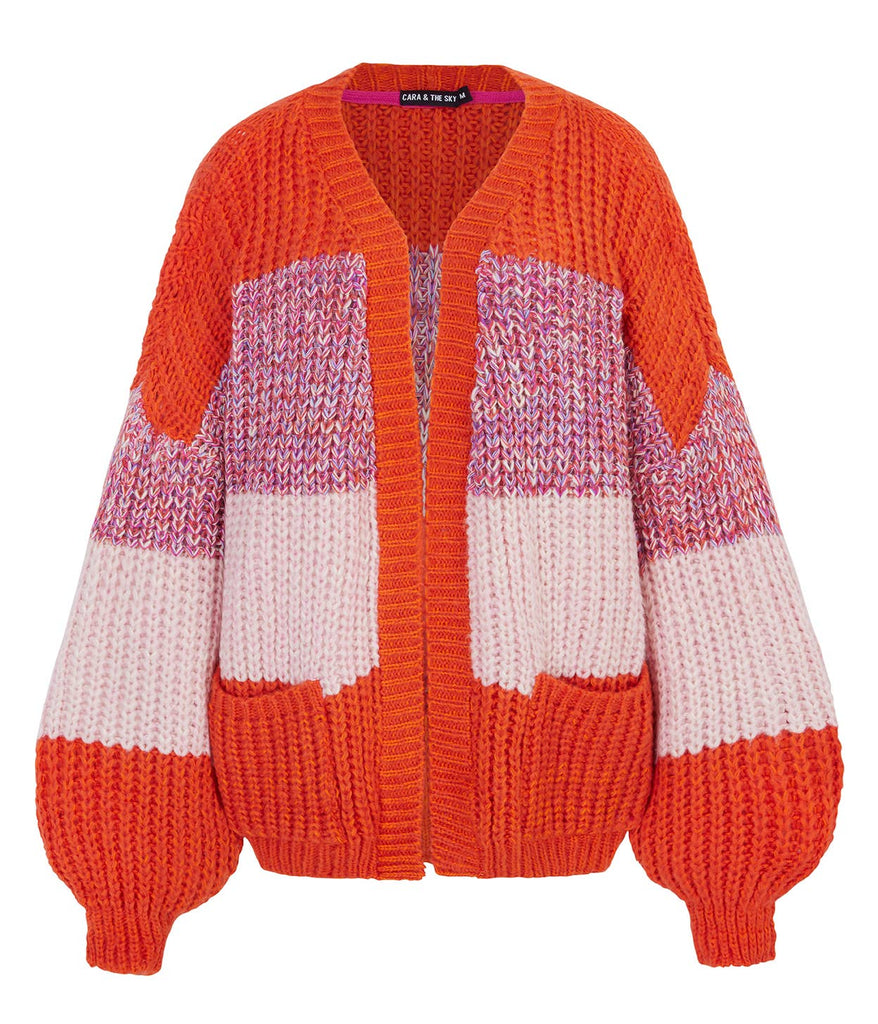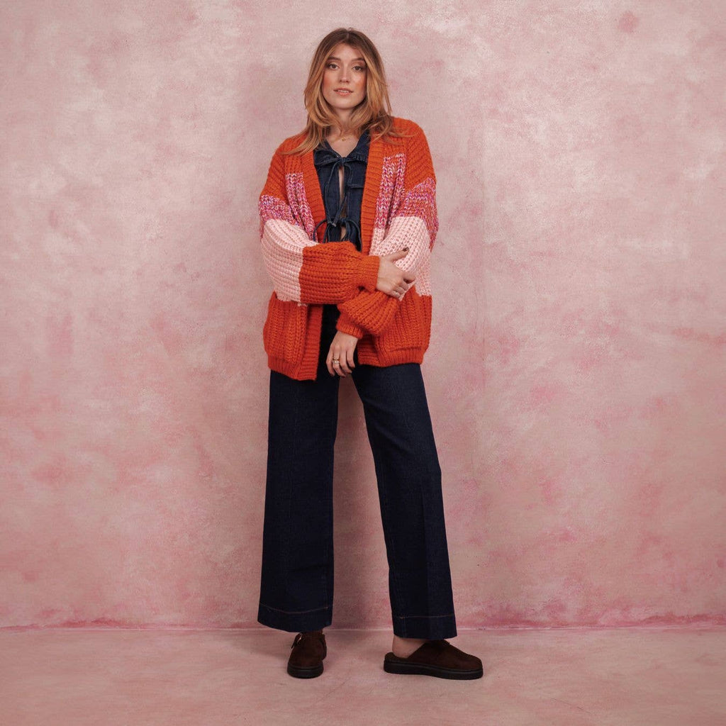 Inject a burst of color into your wardrobe with the Janie Oversized Chunky Stripe Cardigan. Crafted by Cara & the Sky, this striking piece features a unique bold orange stripe combined with pinks, blues, and purples, creating a distinctive look unique to the brand. Its relaxed oversized silhouette and chunky ribbed edges offer both comfort and style, making it a perfect choice for brightening dull winter days. Made in small batches in the UK from vegan-friendly, ultra-soft yarns, Janie pairs effortlessly with denim for brunch or layered up for crisp autumn outings and festive markets.