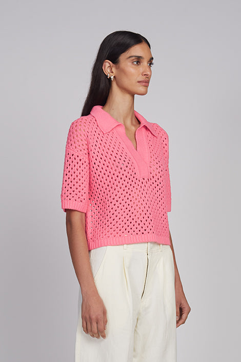 The Nina Polo returns by popular demand in a lively Taffy Pink hue. Knit from sleek Peruvian cotton, this polo-collar sweater features a mid-weight open-mesh stitch that drapes with effortless femininity. Subtle retro notes lend a sense of nostalgia, making it a graceful transitional piece designed for modern romance and quiet elegance.