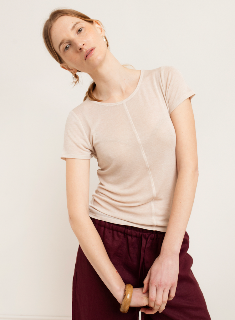 Soft, sheer, and effortlessly flattering, the Echo T-Shirt features a clean seam down the front and a slim fit with a gently contoured silhouette. Lightweight and breathable, it layers seamlessly or stands alone for an elevated everyday look.